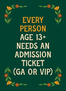 Each person age 13+ needs an Admission Ticket (GA or VIP).